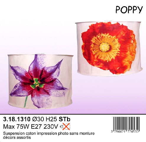 SUSPENSION TISSU BLANC POPPY IMPRESSION PHOTO 2 ASSORTIS (ORCHIDEE ET COQUELICOT) HAUTEUR : 25 CM DIAMETRE : 30 CM.