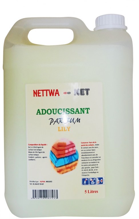 Adoucissant parfum jasmin de très bonne qualité, de fabrication européenne : France - Allemagne ou Grande Bretagne. Bidon de 5 litres = 70 lavages, Possibilité de faire des étiquettes propres à votre nom avec votre logo uniquement à partir 40 colis. Cet adoucissant de grande qualité peut être utilisée en lave linge uniquement. Actuellement existe en flacon de 5 litres x 4 et de 2 litres x 8, bientôt on va lancer flacon de 3 litres x 4 par colis. Adoucissant très efficace au lavage, adoucie votre linge et lui procure un excellent parfum et peut être, utilisée aussi bien pour le linge en couleur - blanc et noir. Possibilité de vous envoyer des échantillons, pour essayer notre produit avant de vous vous engager dans des achats importants. Notre Adoucissant peut être utilisée aussi bien par les particuliers que par les professionnelles de laverie Bidon de 5 litres = 70 lavages.