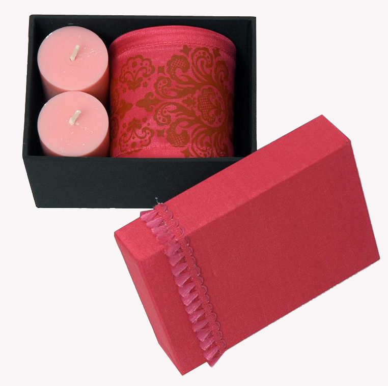 Coffret Votive contenant un bougeoir photophore en verre entouré d'une housse en tissu barqoue, et 2 bougies.