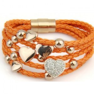 Bracelet tendance avec tissage en cuir, breloques, coeurs plaquage or rose et un coeur serti de cristaux Black swan. Couleur disponible : orange