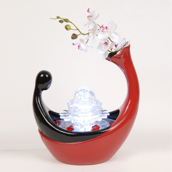 Ce modèle est composé d'une vasque en céramique accueillant au centre une boule en verre entrainée en rotation par l'écoulement de l'eau. Ce modèle offre un mariage parfait des couleurs avec cette vasque rouge et noire et l'éclairage blanc froid. De plus, elle peut faire office de soliflore en accueillant une fleur dans l'espace prévu (fleur non fournie).