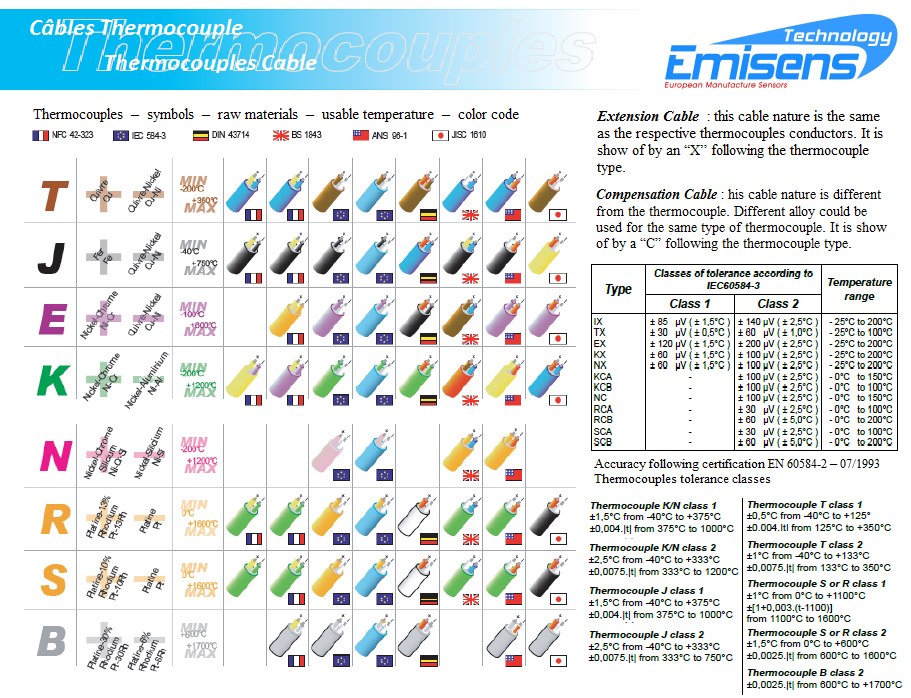 Cable de compensation : c'est un câble de nature différent du thermocouple. Différents alliages peuvent être utilisés pour un même type de thermocouple. Il est désigné par un “C” après le type de thermocouple.