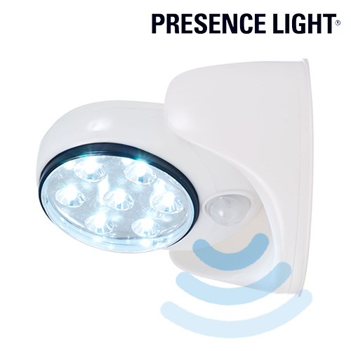 La lampe Presence Light avec détecteur de mouvement s'illumine quand il détecte du mouvement (Jusqu'à 20 mètres de distance) grâce à sa technologie infrarouge. Ce détecteur de mouvement avec lumière LED Vous sera très utile pour la sécurité de votre foyer et pour illuminer beaucoup d'endroits de votre maison (escaliers, vestiare, cour, etc.). La lampe Presence Light avec détecteur de mouvement s'installe très facilement. Il suffit de coller sa surface adhérente sur l'endroit désiré (il peut être aussi visser, même si les accessoires nécessaires ne sont pas compris).