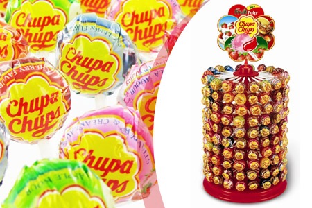 Présentoir tourniquet avec 200 sucettes Chupa Chups aux goûts fraise, pomme, cerise, cola,orange, pasthèque, mangue et fraise crémeuse.