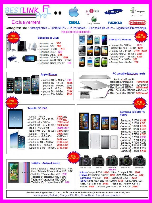 Grossiste en télephonie, Tablettes Tactiles, Consoles de jeux: vend des téléphones smartphones de marques : Apple, Samsung, HTC, Nokia, Sony Ericsson etc... ... .