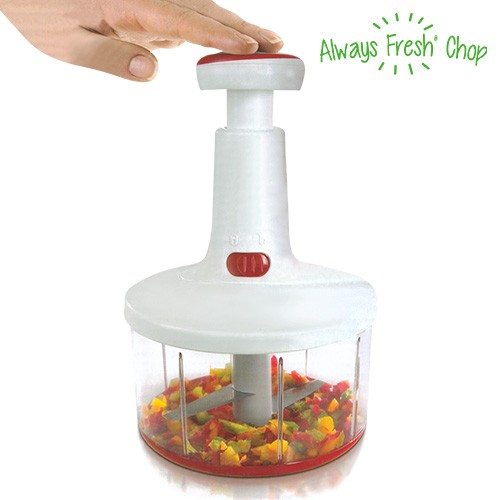 Le hachoir Always Fresh Chop, révolutionnaire et pratique, deviendra un accessoire indispensable dans votre cuisine. Avec lui, vous pourrez préparer tout genre d'aliments facile et rapidement. Il fonctionne manuellement, vous ne devrez que presser. Sans câbles, sans piles, sans électricité... Imaginez combien vous allez épargner ! Always Fresh Chop vous permet de hacher et couper des légumes, de la viande, du poisson, etc. En plus, vous pourrez préparer aussi de la crème fraîche ou de la mayonnaise car il inclut deux accéssoires différents que vous pouvez utiliser selon si vous allez hacer/couper ou mélanger/battre. Cet hachoir se nettoie facilement et sa base est anti-dérapante.