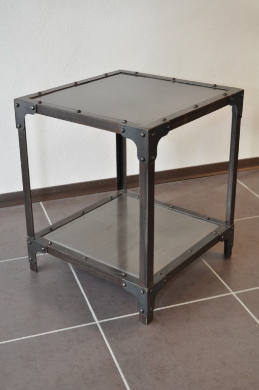 Dans un style industiel le plus pur,le bout de canapé revisite le genre avec élégance et authencité,En acier brut,sa structure en partie rivetées accueille 2 plateaux en métal brillant effet vielli,il sera parfait dans un salon près d'un canapé mais pourra également faire office de console dans une entrée ou table de nuit dans une chambre contemporaine,