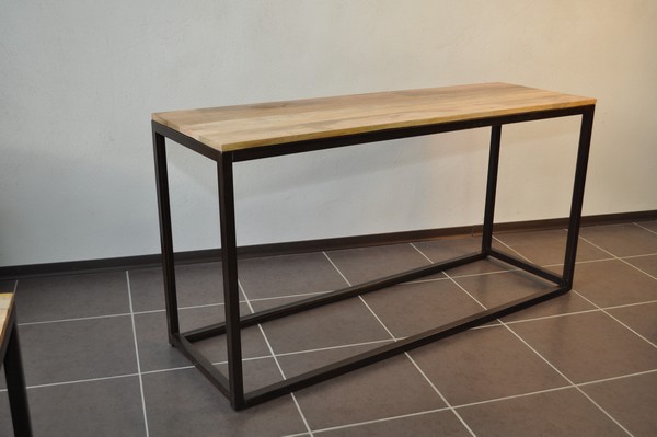 un esprit loft très marqué pour cette console en fer patiné et sont magnifique plateau en manguier massif d'un épaisseur de 2 cm,