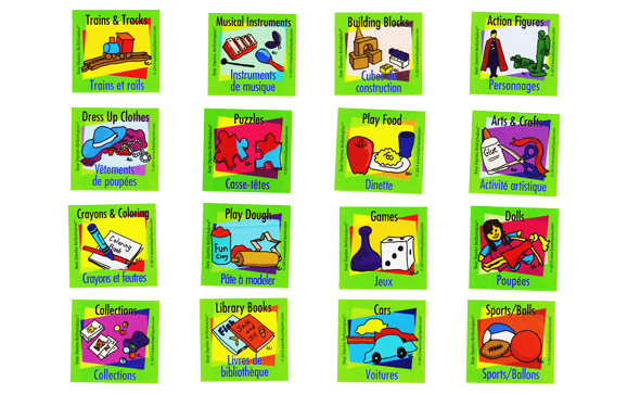Etiquettes de rangement autocollantes réutilisables pour le rangement des jouets.