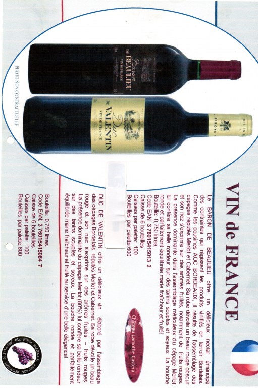 VENDS VINS DE BORDEAUX LE BARON DE BEAULIEU ET LE DUC DE VALENTIN EXTRA MINIMUM 120 BOUTEILLES