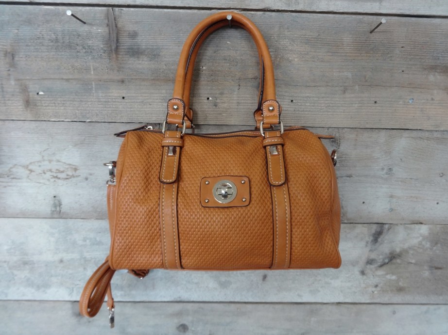 100 pièces Cognac marron sacs à main avec des boucles et une longue bandoulière réglable amovible. Avec poches intérieures, deux avec fermetures à glissière.