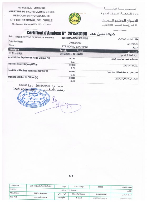 60 litres d'huile pure de pépins de figue de barbarie, obtenues par première pression mécanique à froid, sans utiliser aucun adjuvant, issue de culture conduite en mode bio - Récolte Aout 2015, Date pressage Séptembre 2015- Origine Kairouan Tunisie - Excéllentes caratéristiques phisico-chimiques et organoleptiques.
