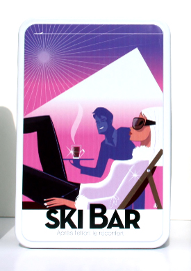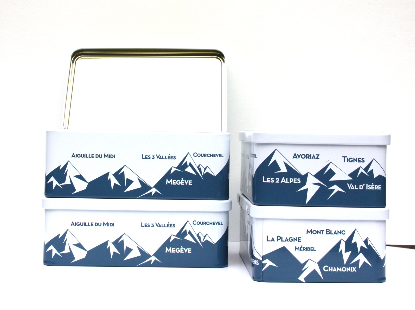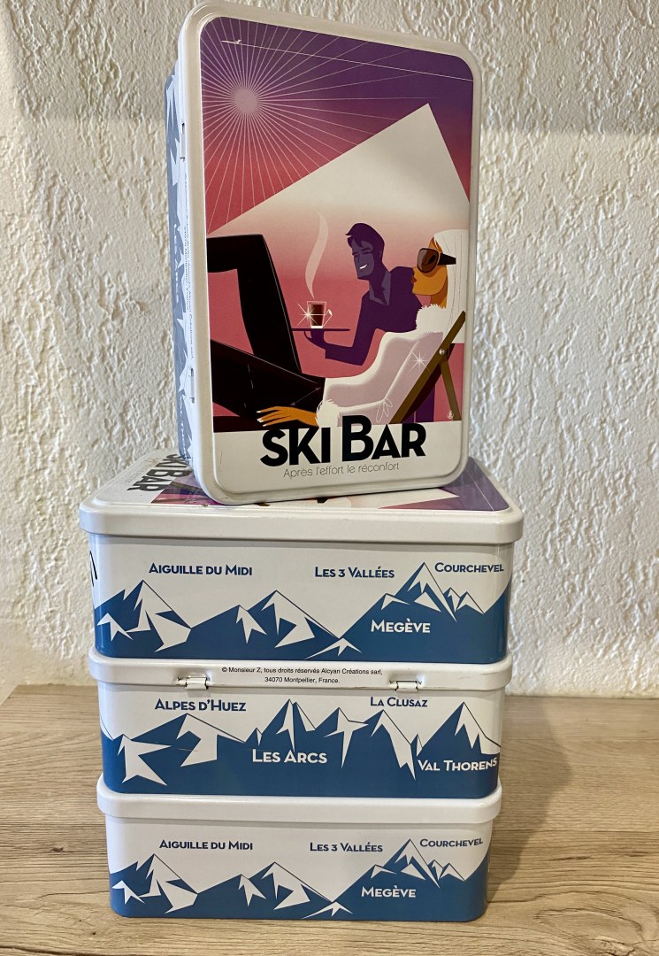 Boites à sucre en alu avec charnière made in France, imprimées de 2 visuels Alpes (Montagne) et Ski Bar, "Après l'effort, le réconfort" sous licence exclusive Monsieur Z avec le tour imprimé de montagnes et des noms des grandes stations des Alpes : LaPlagne - Mont blanc - Méribel - Chamonix - Val