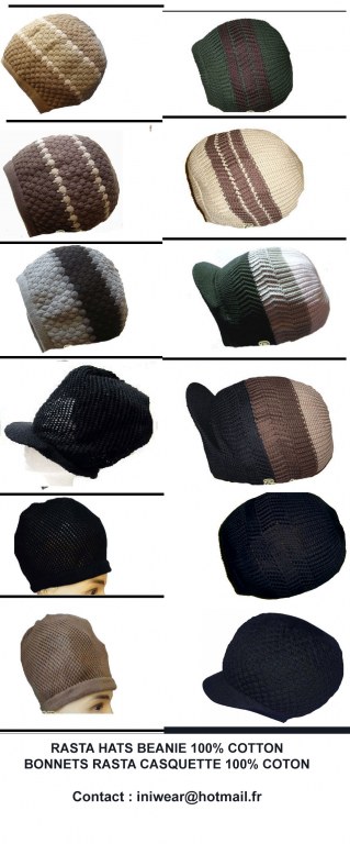 Spécialisé dans les produits Rasta et reggae nous proposons des bonnets et casquettes d excellente qualités en 100% coton pour les dreadlocks