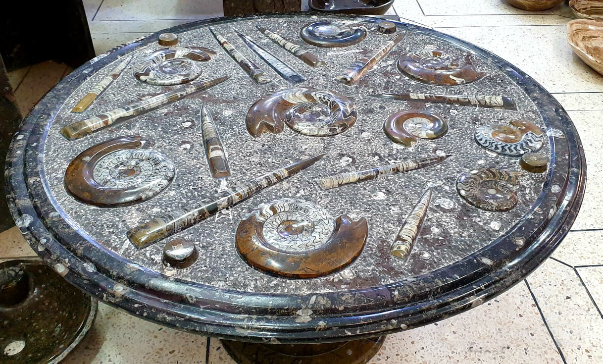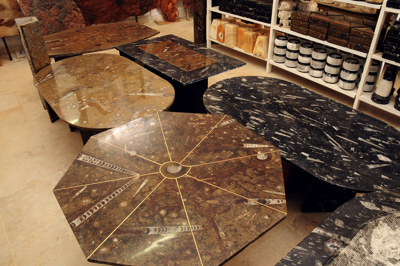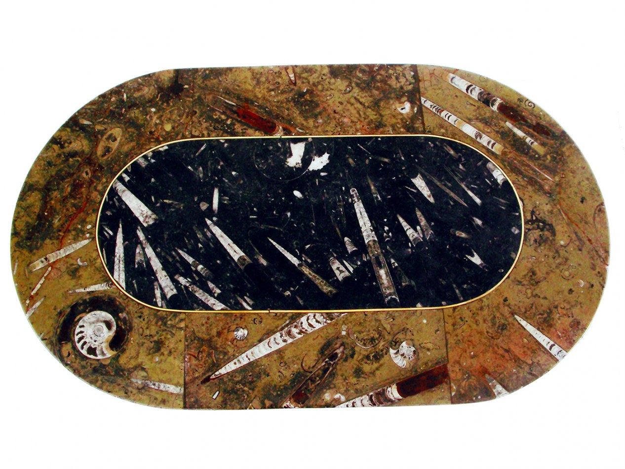 Exquise collection de tables d'un grand raffinement de conception et d'exécution en marbre préhistorique agrémentés en fossiles datant de plus de 350 millions d'années et qui s'adapteront tout naturellement à votre décoration d'intérieur et d'extérieur.