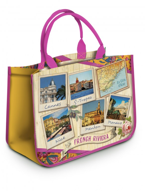 vente sacs cabas régionaux, Côte d'Azur, Monaco, Pays Basque, 8 modèles différents cousus aux bords arrondis ultra-résistants en polypropylène avec une finition brillante- anses renforcées - vendus avec fond de soutien rigide noir. Emballés individuellement sous film.