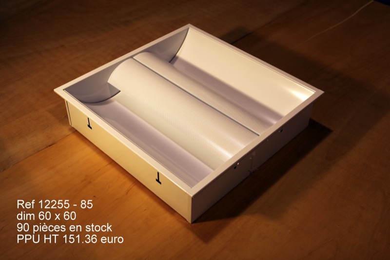 Vente en un seul lot de 5 000 plafonniers pavés d'eclairage encastrés ou non. Diverses reférences et modèles. La référence la mieux représentée est en 600 exemplaires avec ses tubes fluo installés. Marchandise neuve, emballée individuellement, inventoriée, palétisée (100 palettes environ). Prix pro 250 000 k€. Prix déstocké 5 € pièce, soit 25 000 € HT les 5 000 pièces. Contact Dominique Ferrand au 06 34 02 18 56 ou gtrnice06@gmail.com