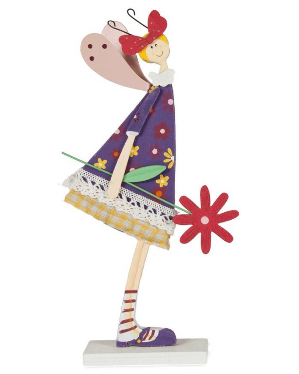 Type de déco artisanale : découpes bois colorées, avec petits accessoires tissus et métal.