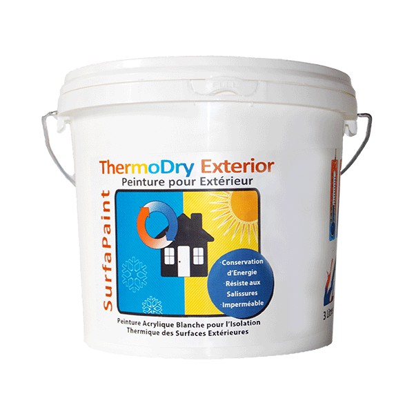 Lorsque l'énergie thermique traverse les murs et autres surfaces, de grandes quantités d'énergie sont souvent nécessaires pour le refroidissement en été et le chauffage en hiver. SurfaPaint ThermoDry Exterior est une peinture d'excellente qualité professionnelle, aux propriétés d'isolation thermique de haute performance, idéale pour une utilisation en extérieur. Composée de la technologie de SurfaPore ThermoDry, elle contient des nanoparticules et des microparticules spécialement conçues pour apporter aux matériaux une fonction d'isolation thermique contribuant à bloquer le transfert de chaleur, réfléchir le rayonnement thermique, et créer une barrière contre l'humidité. En imperméabilisant la surface peinte, elle minimise l'humidité, la condensation, et empêche la croissance de moisissures. Idéale pour les milieux exposés aux variations de températures et de climat extrêmes, elle protège la surface des microfissurations. Dotée d'un haut pouvoir couvrant, elle protège les surfaces des ponts thermiques, même exposées à de basses o températures (-20 C) et/ou à de hautes températures et variations, sans risquer de s'effriter. SurfaPaint ThermoDry Exterior est une peinture qui laisse la surface perspirante tout en la rendant imperméable à l'eau et hautement résistante à l 'alcali et aux rayons ultaviolets (U.V.). Elle peut être utilisée comme une base pour des teintes aux nuances claires