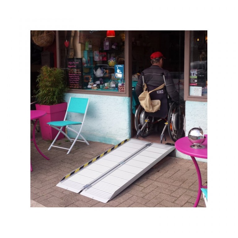 Rampes d'accès de type valise, 99 € H.T. comprenant une rampe valise de 61 cm accès droit, pictogramme "accès P.M.R." , sonnette sans fil et livraison sur toute la France, sous 72 h