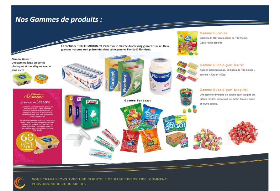 hello we are a tunisian company of : cookies - biscuits - sugar and sugar -free chewing gum sticks - bubble gum - gum balls - bubble gum dragees, melon shape , powder& liquid filled , leader on the tunisian market and exporting our products to more than 15 countries in the 4 continents. we are looking for serious and strong partners for a wide distribution , so we have the pleasure to present you our full range of products suiting to consumers and corporate requirement . do not hesitate please to contact us if you are interested