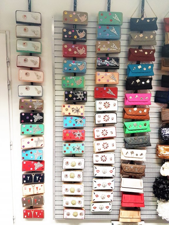 composé de 2800 porte-monnaie zippé en matière synthétique vernie avec motifs en strass ou motifs animaux avec miroir intégré.
