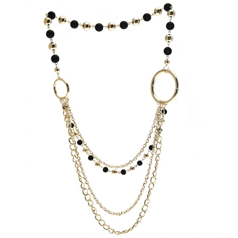 MAGNIFIQUE SAUTOIR COMPOSE DE MULTI RANGS DE CHAINES ET COMPOSANTS EN ALLIAGE DORES ET DE PERLES INTERCALAIRES EN RESINE. ALLIAGE DE ZINC GARANTI SANS PLOMB ET SANS NICKEL. LONGUEUR MAXIMALE 1M.