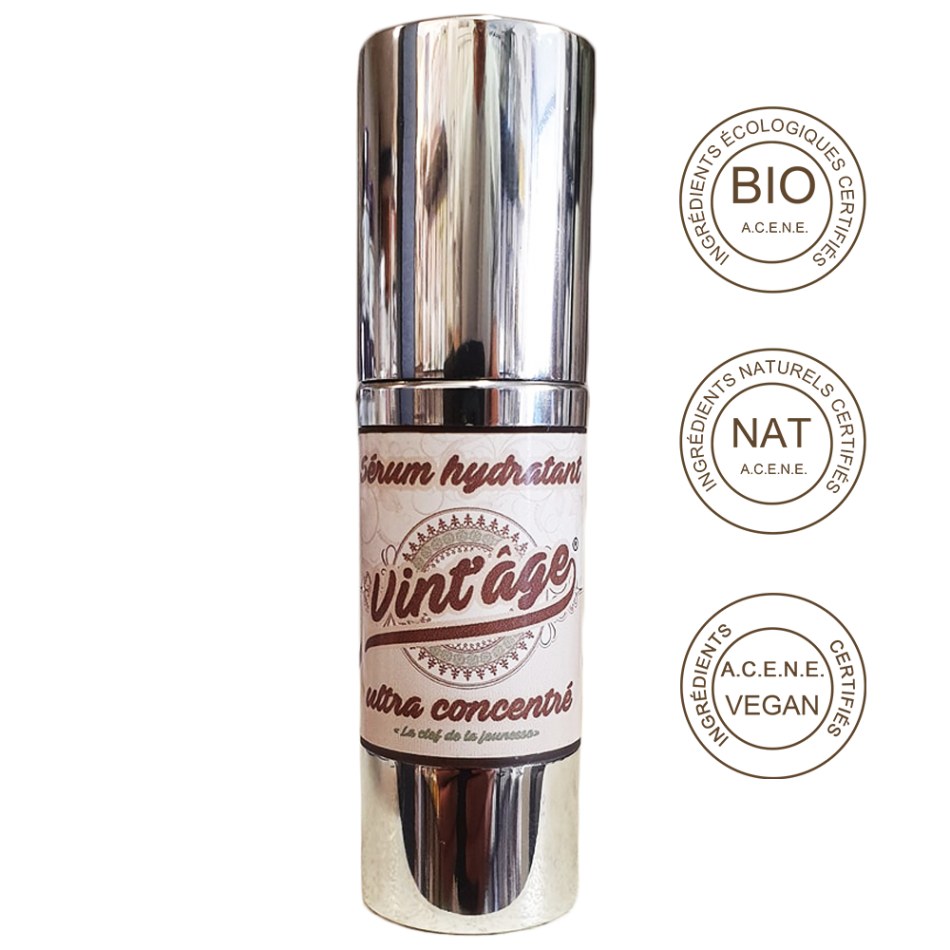 Sérum hydratant Vint'âge ultra concentré composé d'Aloe Vera, Acide Hyaluronique, Huile d'Argan, Vitamine C et de la Rhubarbe