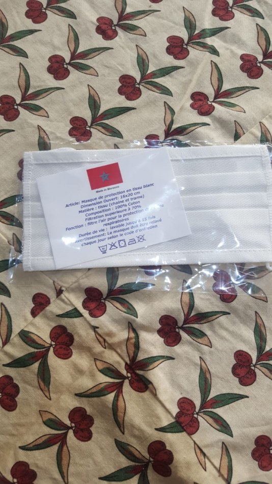 Vend masques de protection en tissus lavable blanc, dimension ouvert : 16 x 20 cm. Origine Maroc.