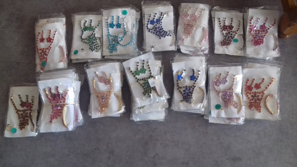 Les parures colorées contiennent un collier, un bracelet, des boucles d'oreilles et une bague.