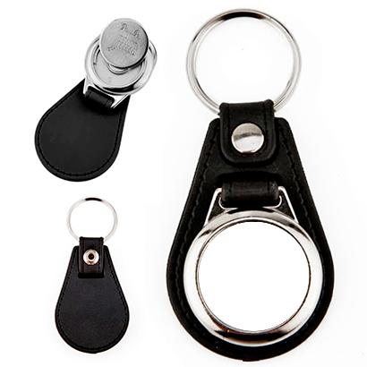 Porte clés simili cuir et métal chromé équipés d'un jeton de caddie en acier.