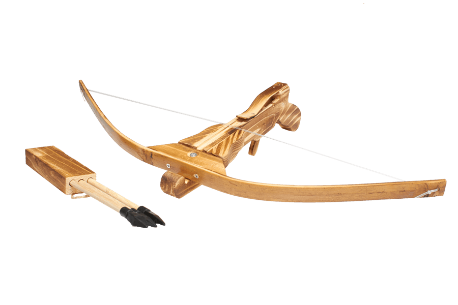 Arbalète en bois 50cm. Chaque arbalète est fournie avec 3 flêches ou 3 pointes (au choix) ainsi qu'un carquois en bois également. Jouets de qualité. Flèches ou pointes en bois d'une longueur de 30cm Quantité: 48 Tarif: 4,75HT
