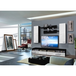 Il se compose de deux tiroirs sur le front commun et de deux niches ouvertes. Les poignées de longueur de 25 cm. Deux bancs TV sont inclus. Vitrine à suspendre fermée : à l'intérieur il y a deux tablettes .Montage de charnières