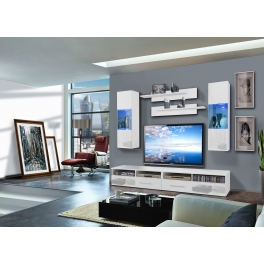 Il se compose de deux tiroirs sur le front commun et de deux niches ouvertes. Les poignées de longueur de 25 cm. Deux bancs TV sont inclus. Vitrine à suspendre fermée : à l'intérieur il y a deux tablettes .Montage de charnières