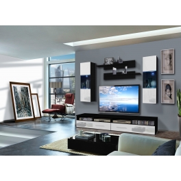 Il se compose de deux tiroirs sur le front commun et de deux niches ouvertes. Les poignées de longueur de 25 cm. Deux bancs TV sont inclus. Vitrine à suspendre fermée : à l'intérieur il y a deux tablettes .Montage de charnières