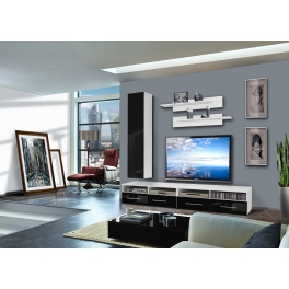 Il se compose de deux tiroirs sur le front commun et de deux niches ouvertes. Les poignées de longueur de 25 cm. Deux bancs TV sont inclus. Vitrine à suspendre fermée : à l'intérieur il y a deux tablettes .Montage de charnières