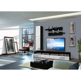 Il se compose de deux tiroirs sur le front commun et de deux niches ouvertes. Les poignées de longueur de 25 cm. Deux bancs TV sont inclus. Vitrine à suspendre fermée : à l'intérieur il y a deux tablettes .Montage de charnières