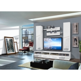 Il se compose de deux tiroirs sur le front commun et de deux niches ouvertes. Les poignées de longueur de 25 cm. Deux bancs TV sont inclus. Vitrine à suspendre fermée : à l'intérieur il y a deux tablettes .Montage de charnières