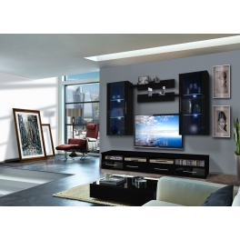 Banc TV qui se compose de deux tiroirs sur le front commun et de deux niches ouvertes. Les poignées de longueur de 25 cm. Deux bancs TV sont inclus. Vitrine à suspendre vitrée : se compose à l'intérieur de deux tablettes en verre