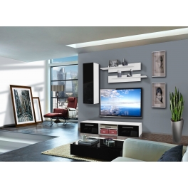 Banc TV avec deux portes abattantes derrière lesquelles il y a un compartiment de rangement. Contient deux niches ouvertes centrales. Les poignées de longueur de 25 cm. Vitrine à suspendre fermée, composée à l'intérieur de deux