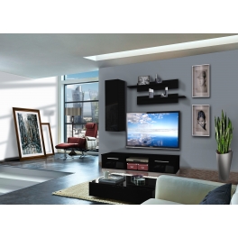 Banc TV avec deux portes abattantes derrière lesquelles il y a un compartiment de rangement. Contient deux niches ouvertes centrales. Les poignées de longueur de 25 cm. Vitrine à suspendre fermée, composée à l'intérieur de deux