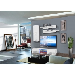 Banc TV avec deux portes abattantes derrière lesquelles il y a un compartiment de rangement. Au milieu il y a un compartiment de rangement séparé par une tablette en verre éclairé par des LED bleus. Les poignées de longueur de 25