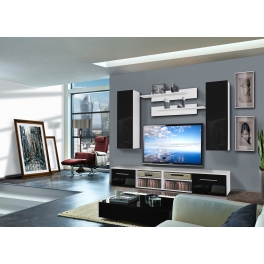 Banc TV avec une porte abattante derrière laquelle il y a un compartiment de rangement avec deux niches ouvertes. Deux bancs TV sont inclus. Les poignées sont de longueur 25 cm. Vitrine à suspendre fermée : composée à l'intérieu