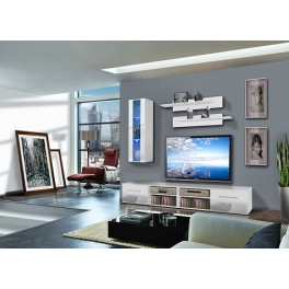 Banc TV avec une porte abattante derrière laquelle il y a un compartiment de rangement avec deux niches ouvertes. Deux bancs TV sont inclus. Les poignées sont de longueur de 25 cm. Vitrine à suspendre vitrée : composée à l'intér