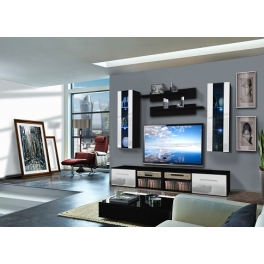 Banc TV avec une porte abattante derrière laquelle il y a un compartiment de rangement avec deux niches ouvertes. Deux bancs TV sont inclus. Les poignées sont de longueur de 25 cm. Vitrine à suspendre vitrée : composée à l'intér