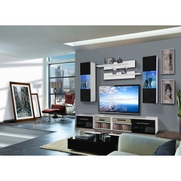 Banc TV avec une porte abattante derrière laquelle il y a un compartiment de rangement avec deux niches ouvertes. Deux bancs TV sont inclus. Les poignées sont de longueur de 25 cm. Vitrine à suspendre vitrée : composée à l'intér