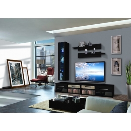 Banc TV avec une porte abattante derrière laquelle il y a un compartiment de rangement avec deux niches ouvertes. Deux bancs TV sont inclus. Les poignées sont de longueur de 25 cm. Vitrine à suspendre vitrée : composée à l'intér