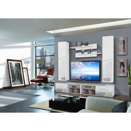 Banc TV avec une porte abattante et un compartiment de rangement séparé par une tablette en verre avec éclairage LED bleu. Porte abattante avec des poignées. Deux bancs TV sont inclus. Vitrine à suspendre fermée : composée à l'