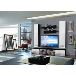 Banc TV avec une porte abattante et un compartiment de rangement séparé par une tablette en verre avec éclairage LED bleu. Porte abattante avec des poignées. Deux bancs TV sont inclus. Vitrine à suspendre fermée : composée à l'