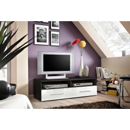 Banc TV avec deux tiroirs de rangement sur le front commun et deux niches ouvertes. Existe en plusieurs coloris. Facile à monter soi-même. Idéal pour tout type de pièce et de décoration.